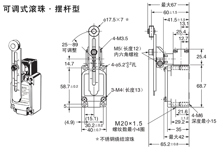 耐高温行程开关 规格型号:SDH-12 触头类型:可调式滚珠·摆杆型 触点类型:1NO/1NC 触点容量:6A,24V250V~440V 操作温度:-20~+350℃ 环境湿度:95%RH 防护等级:IP67 应用范围:广泛使用于电力、化工、石油、纺织、钢铁等行业 特配附件:铜合金镀镍电缆防水接头(M20×1.5)、安装螺丝(304 不锈钢)