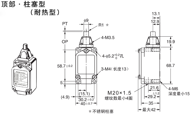 耐高温行程开关 规格型号:SDH-D 触头类型:顶部·柱塞型 触点类型:1NO/1NC 触点容量:6A,24V250V~440V 操作温度:-20~+350℃ 环境湿度:95%RH 防护等级:IP67 应用范围:广泛使用于电力、化工、石油、纺织、钢铁等行业 特配附件:铜合金镀镍电缆防水接头(M20×1.5)、安装螺丝(304 不锈钢)