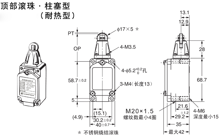 耐高温行程开关 规格型号:SDH-D2 触头类型:顶部滚珠·柱塞型 触点类型:1NO/1NC 触点容量:6A,24V250V~440V 操作温度:-20~+350℃ 环境湿度:95%RH 防护等级:IP67 应用范围:广泛使用于电力、化工、石油、纺织、钢铁等行业 特配附件:铜合金镀镍电缆防水接头(M20×1.5)、安装螺丝(304 不锈钢)